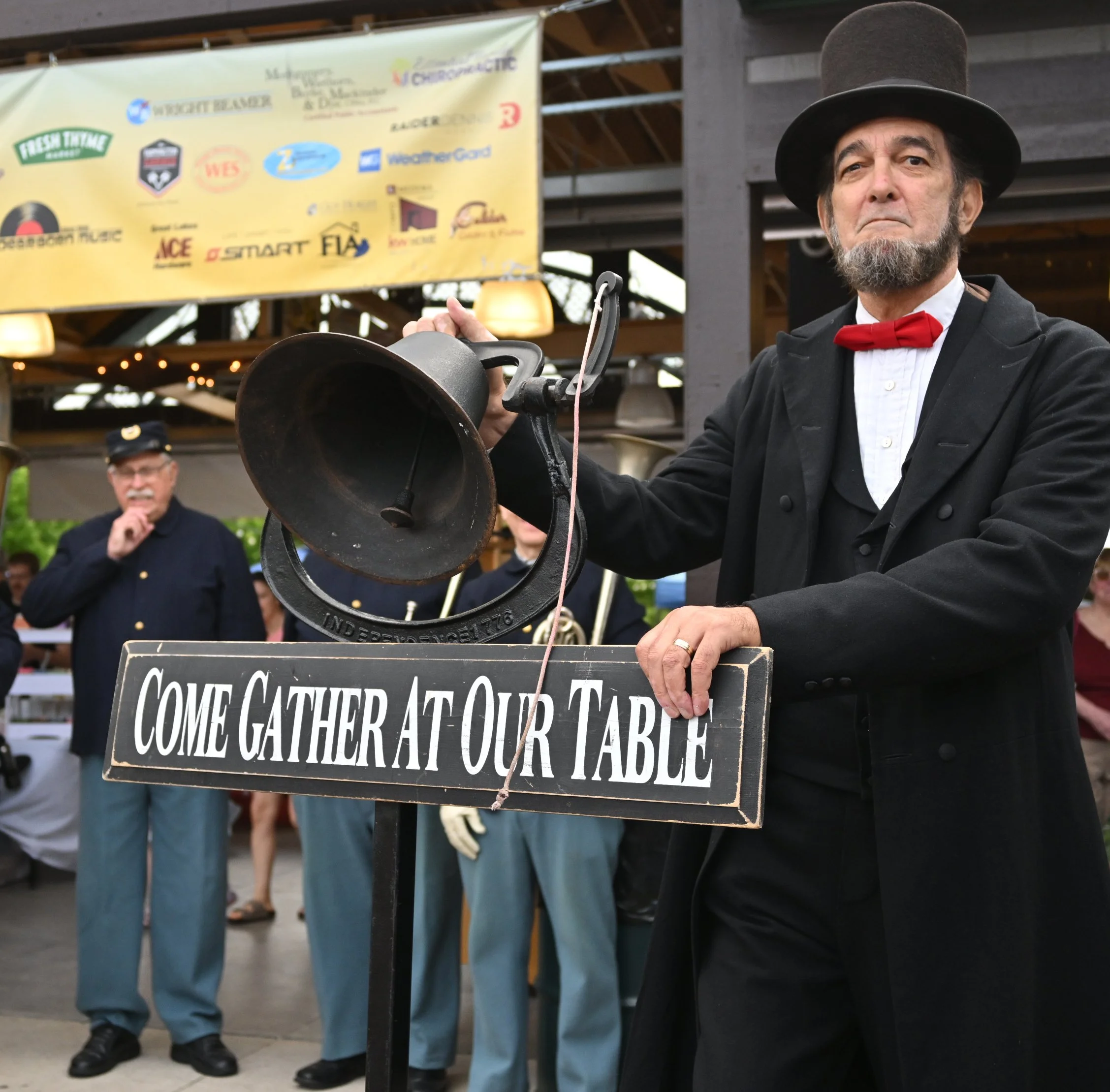 President Lincoln stands solemly during the Pledge of Allegiance and then rings the bell to open the Market.