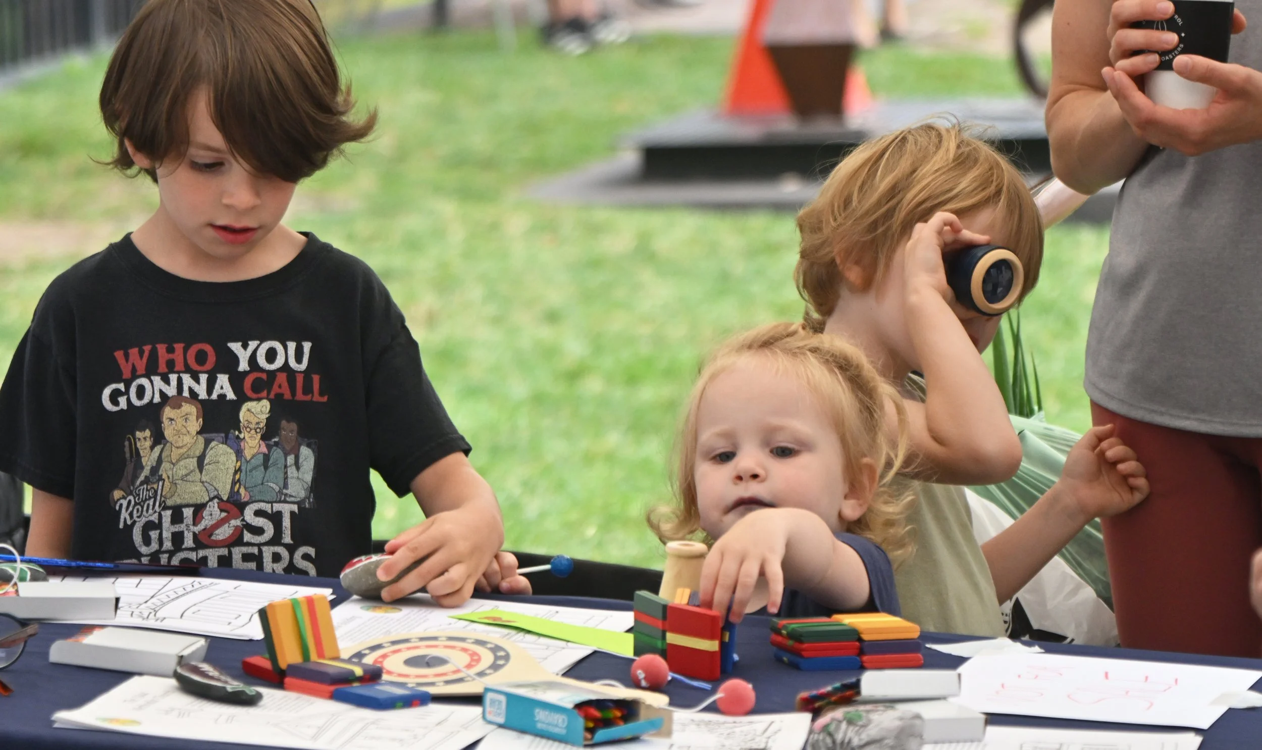 President Lincoln checks out the Market’s Bicentennial display while a visitor stops to read about Nathan Power, the son of Farmington’s founder, and his work with the Underground Railroad. Bottom, children check out some old-time toys.